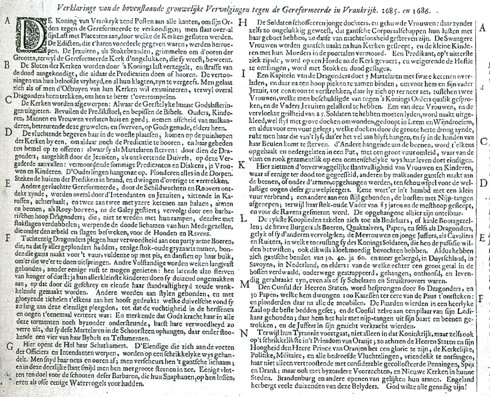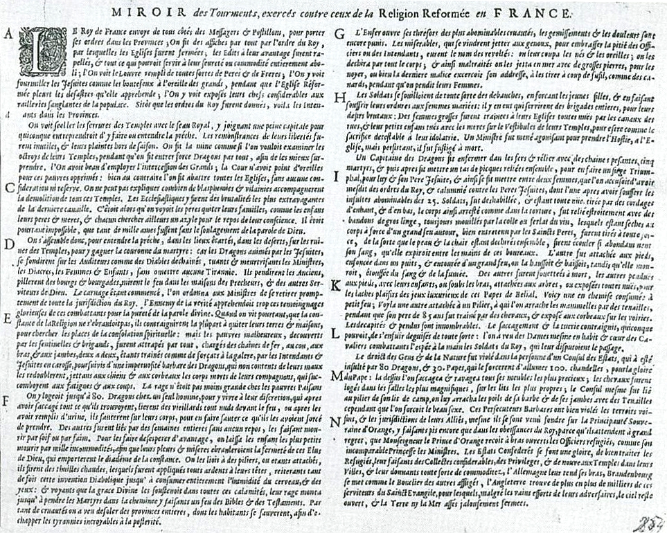 Plate 1 displays the destruction and outrageous torment perpetrated by the soldiers of Louis XIV, condoned and egged on by the Catholic Church (Jesuits). In 1686 Romeyn de Hooghe produced an unsigned plate which was divided into two separate columns, one in Dutch and one in French, with scenes showing the violent methods employed to obtain conversions. The scenes of brutal outrage are somewhat exaggerated.